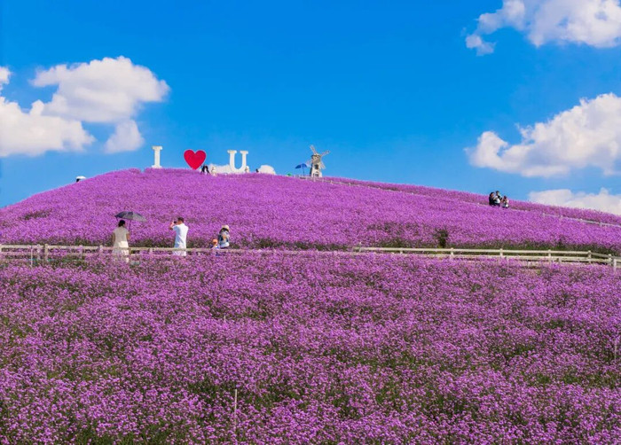 花溪区高坡乡云顶花海景区,游客在梦幻的紫色马鞭草花海中赏花拍照