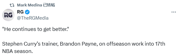 谈到库里的身体状况,Brandon Payne表示:随着球员年龄的增长,球员可能会失去一些速度。但这并没有发生在库里身上。事实上,他的弹跳力比以往任何时候都要好,第一步的爆发力也是职业生涯中最快的。他可以更快地处理球场信息和做出决策,这样可以弥补可能的速度损失。”