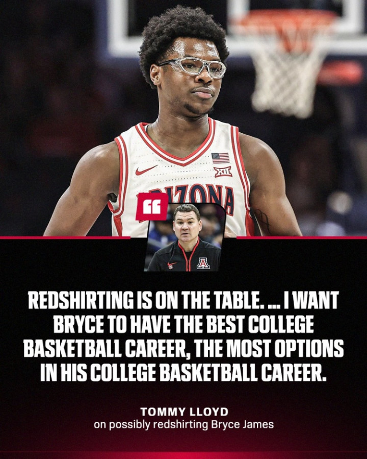 直播吧11月13日讯SportsCenterNEXT报道,亚利桑那大学主教练汤米·劳埃德已经就可能的红衫赛季与布莱斯·詹姆斯进行了“多次谈话”。(注:红杉赛季大致可以理解为球员休战一个赛季,这一年不作数。以布莱斯举例,如果他大一赛季为红杉赛季,他可以从大二打到大五。)