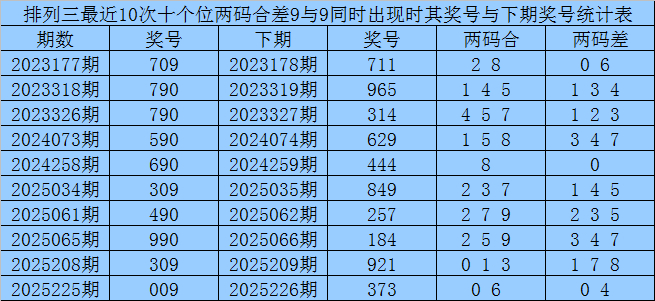 十个位合差分析:上期奖号十个位开出90组合,两码合为9,两码差为9,最近10次十个位两码合9与两码差9同时出现时,其奖号和下期奖号分别为: