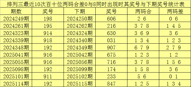 百十位合差分析:上期奖号百十位开出19组合,两码合为0,两码差为8,最近10次百十位两码合0与两码差8同时出现时,其奖号和下期奖号分别为:
