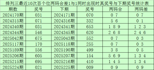 百个位合差分析:上期奖号百个位开出10组合,两码合为1,两码差为1,最近10次百个位两码合1与两码差1同时出现时,其奖号和下期奖号分别为: