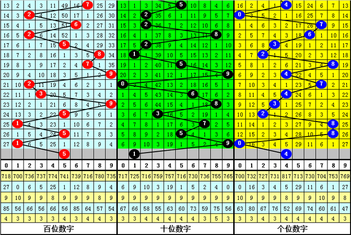 从以上统计可以看出,十个位两码合差9与9同时出现之后其下期两码合差表现最热的4个分别为:0134,本期十个位两码合差可以参考这四码中的数据。